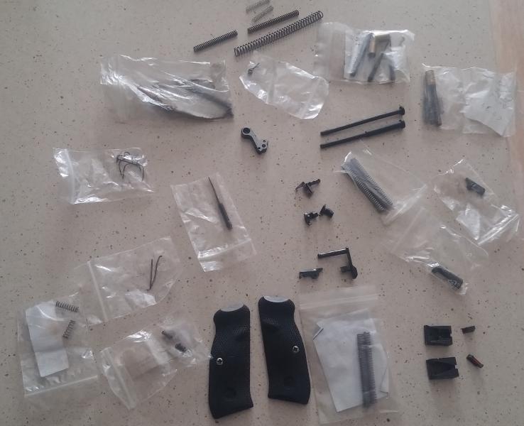 2 expulsoras, 1 retenida, 2 puntos de mira y 2 alzas, muelles de todo tipo, cachas de goma, 2 desconectores, martillo original, 2 guias y mas piezas, os lo pongo todo aparte en otra foto y otro mensaje.