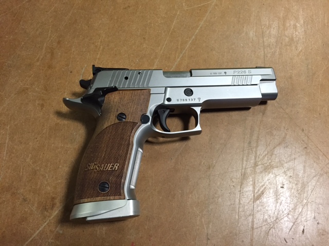 Una Sig Sauer P226S en caliber 9mm Pb. Acabado inox y cachas de madera. Con maletin original. Como la anterior en estado excepcional practicamente sin uso.