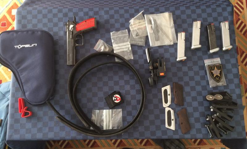 --cachas de aluminio, cachas de aluminio rojo, 4 cargadores de aluminio, funda ghost, 5 portacargadores, cinturón doblealpha talla 36(ni gordo ni flaco, jeje), porta cascos de tiro, maletín original tanfoglio con combinación, kit de limpieza, funda de poliéster top gun con cremallera, muelles de varios tipos y libras.