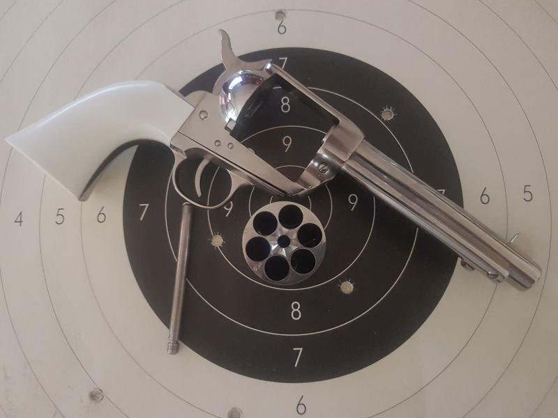 Compañero, con ánimo de clarificar un poco el tema, te pregunto por la marca del revolver. Imagino que quieres decir « tipo colt» cuando te refieres a él.