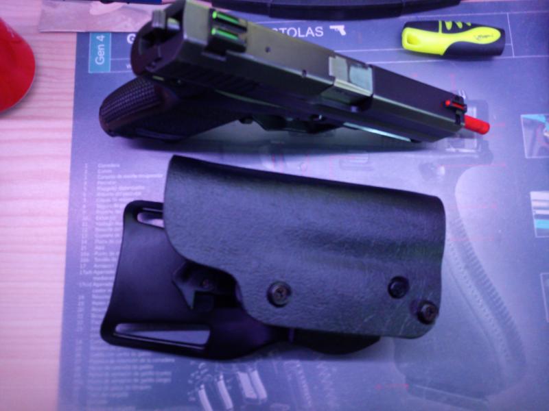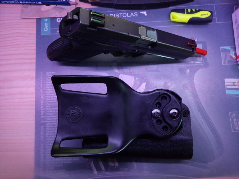 Varias fundas paisano y servicio. Las de servicio tienen una pala baja y la de paisano acople de cinturón.