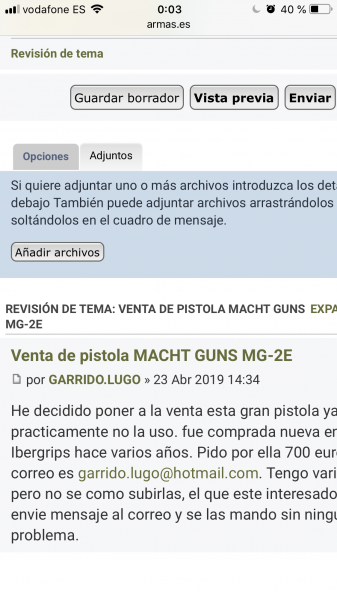 [quote="GARRIDO.LUGO"]He decidido poner a la venta esta gran pistola ya que practicamente no la uso. fue comprada nueva en Ibergrips hace varios años. Pido por ella 700 euros. Mi correo es garrido.lugo@hotmail.com. Tengo varias fotos pero no se como subirlas, el que este interesado que me envie mensaje al correo y se las mando sin ningún problema. Gracias por la explicacion, van unas fotos.