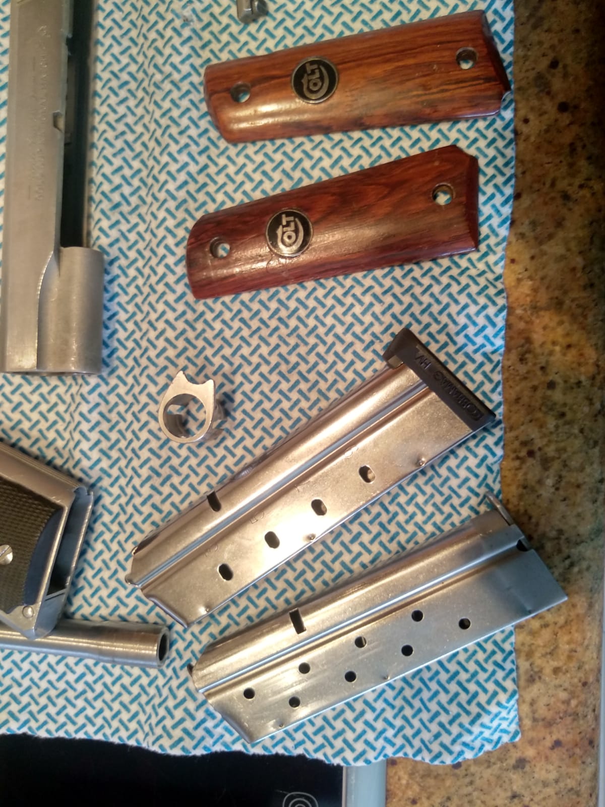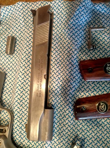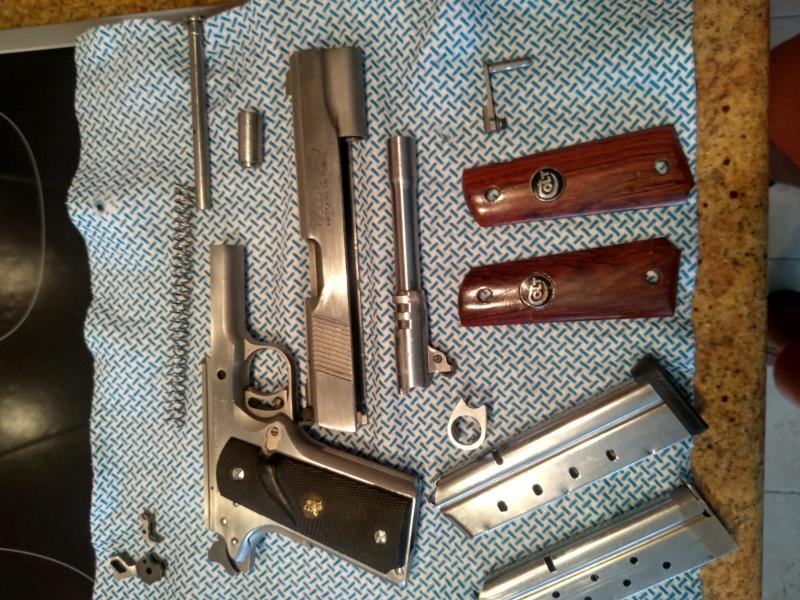 Hola, un amigo que por edad no va a renovar licencia, me pide que anuncie esta pistola, es una Colt gold cup national match de 9 mm, acabado inox, el la ha tenido guiada en B, antes estuvo en F y antes en A, tiene 2 cargadores, cachas de madera colt y una colt semi anatómica de goma.