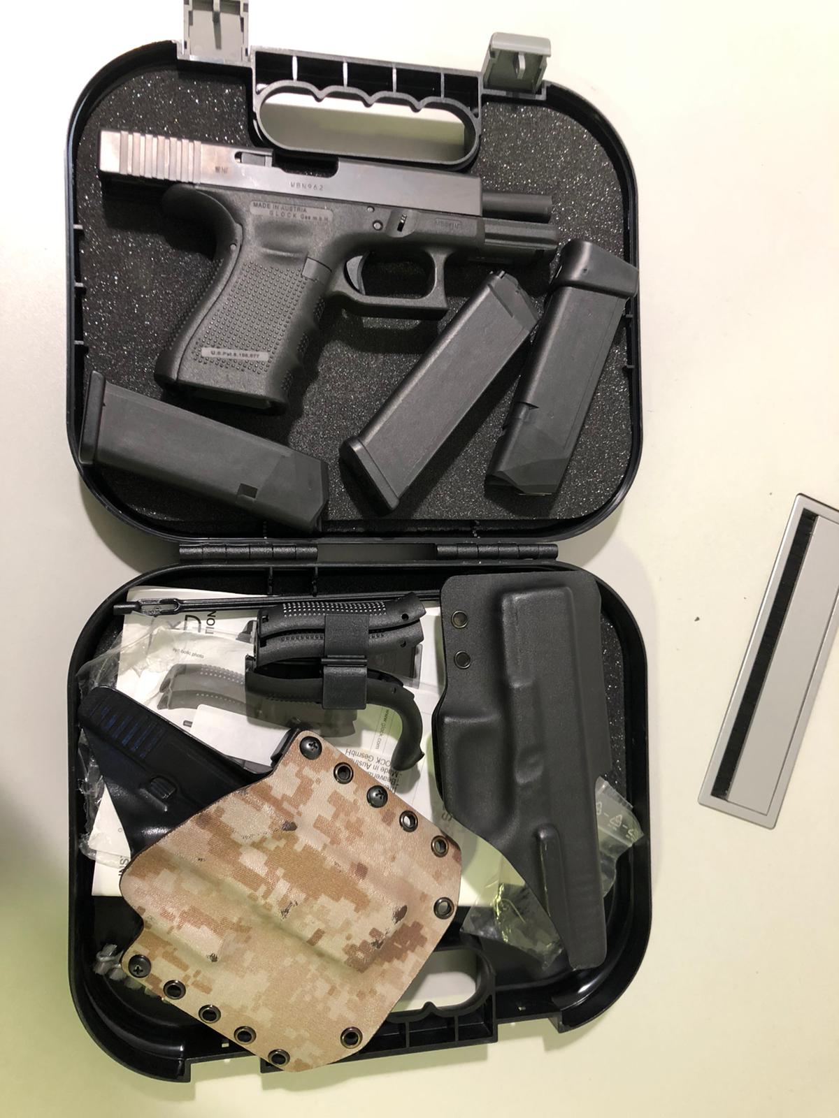 Se vende glock 19 gen 4 por falta de uso, muy pocos tiros, en perfecto estado, disparador a 2kg, 3 cargadores, uno de glock 17, el otro mas dos y uno normal, dos fundas de kydex, una interior y otra exterior.