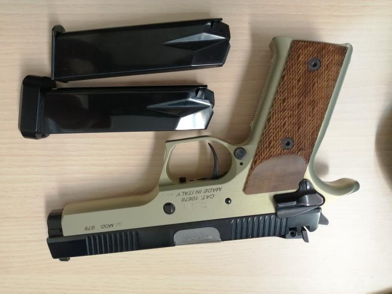 la pistola tiene un cargador extra (tres en total), el muelle de la corredera que lleva puesto esta recortado para tirar munición recargada, pero entrego uno nuevo, y una base de aluminio +2 original Pardini.