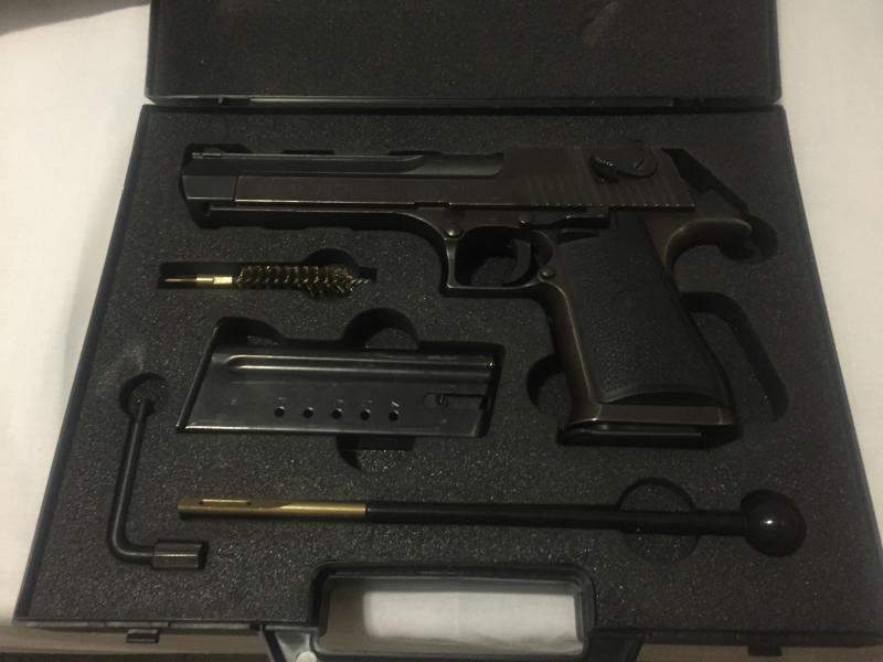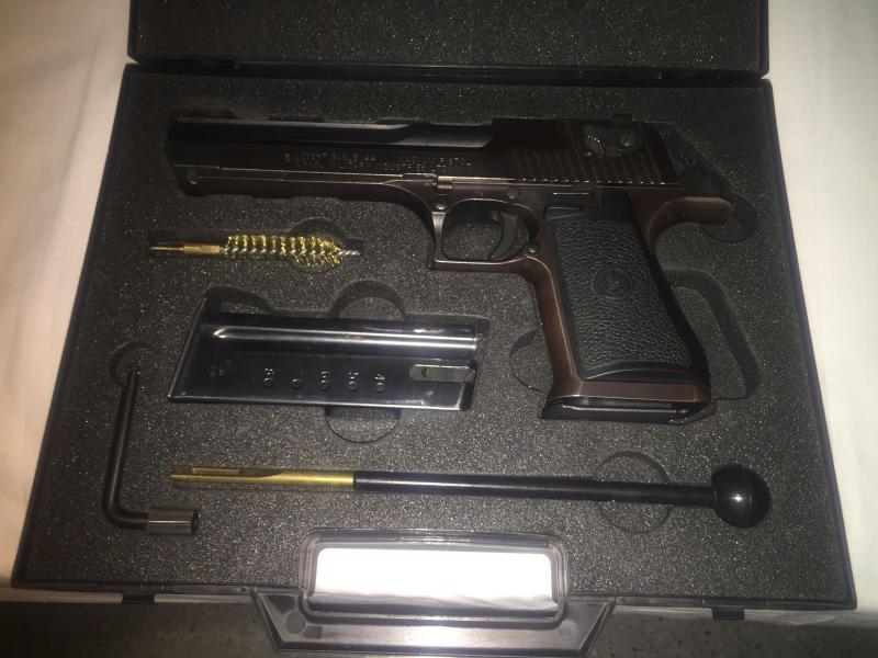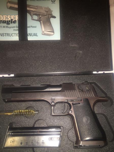 Hola a todos, pongo en venta Pistola Desert Eagle, calibbre .44, en Perfecto estado con dos cargadores, maletín y factura. la vendo por que la he utilizado muy poco solo tiene realizados 100 disparos esta impecable color negro, Precio1100 Euros negociables.