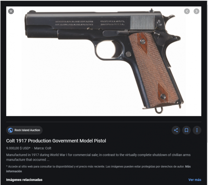Disculpa, pero creo recordar, y hablando de memoria, que no existe ningún Colt M1911, del año 1903, pues aun tardaria Browning varios años en diseñarlo, creo recordar que sus primeros diseños, son de 1908, mas o menos. Creo que le hicieron algún cambio en 1917, y en 1938, salió la modificación A1, y la verdad, tan antiguos, y que no sean un cacho de puro oxido y corrosión, llegan a precios inalcanzables para la mayoría de mortales, por lo menos, en USA, su tierra.................