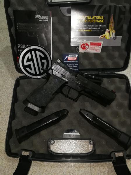 Arma en perfectas condiciones con 2 cargadores extra, Talon Grip y funda Ghost hybrid de regalo. Tiene menos de un año como se demuestra en la fotografía, se puede probar sin compromiso, se encuentra en Baleares. Arma apta para produccion, standard y carry optics colocándole un visor de punto rojo(corredera adaptada de serie para DPP o Sig Romeo)