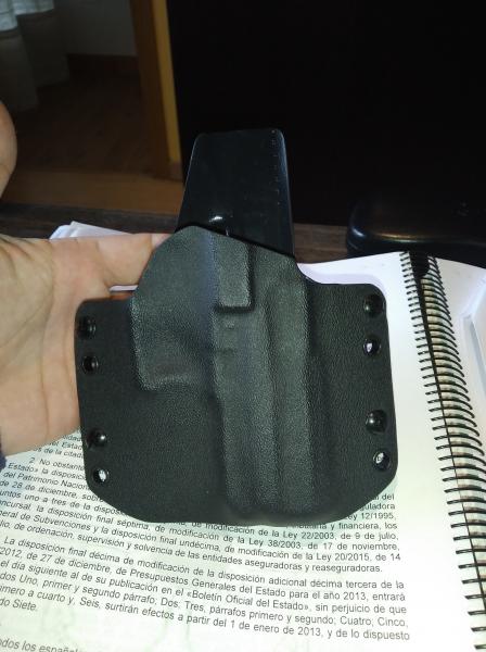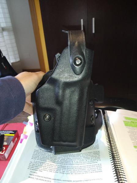Se acompaña de tres cargadores, funda Safariland 6280 con plataforma de pernera con cinta unica RADAR y QLS para cambio rápido, y otra funda riñonera en kydex. Además de lomos y laterales intercambiables.