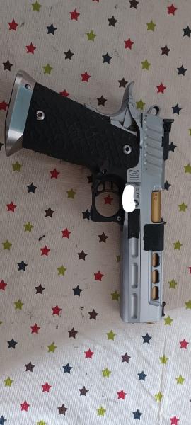 Disculpa, compañero pero me gustaría que me informases si esta pistola que vendes, a sido empleada en la categoría OPEN, quizás por el anterior propietario, te lo comento por la observación de los cuatro taladros en el lateral izquierdo. Gracias por tu atención Saludos, EZAPAC.