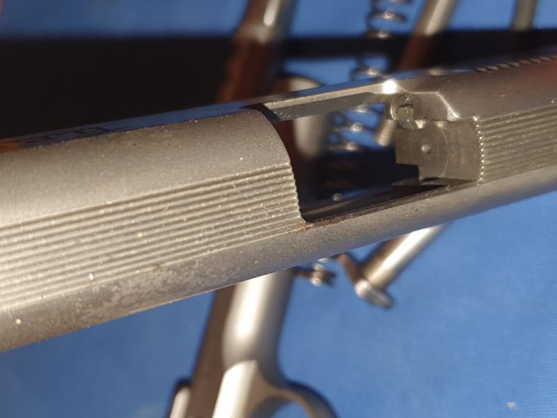 Este socio la ha utilizado muy poco, y la pistola tiene unos ajustes excepcionales y el cañón a espejo, pero el único defecto es que descuidó la limpieza y le salieron unas manchas en la corredera, sin llegar a hacer picados.
