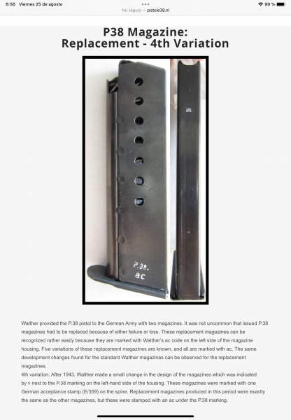 He conseguido hacerme con una Walther p38 ac43, pero el cargador no se corresponde con el año del arma, de ahí que estoy buscando un cargador correspondiente a ese año (1943). Si alguno tiene un cargador correspondiente a ese año estaría muy interesado en adquirirlo.