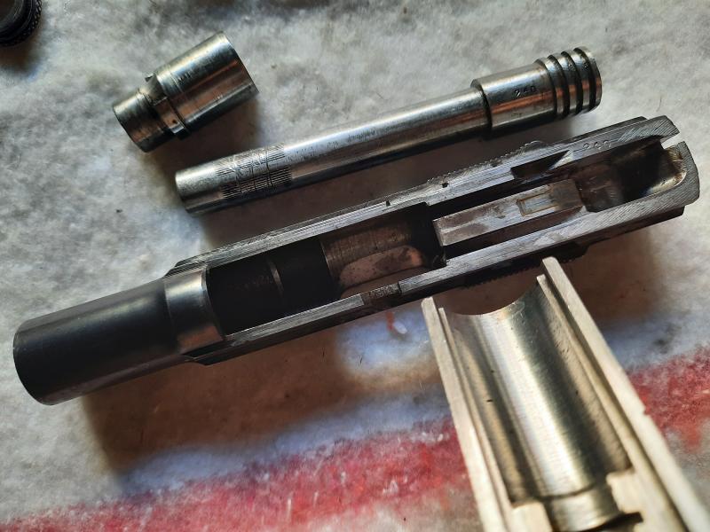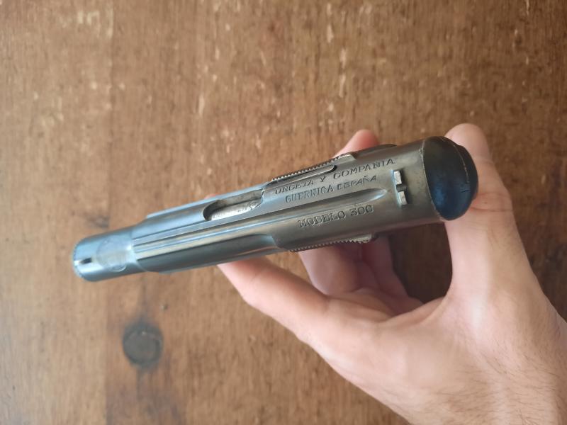Toda la numeración es coincidente y lleva las cachas originales de asta. El pavón es también el original (sin pavonar por dentro) y muestra un poco de desgaste en la parte delantera de la corredera y encima del arco guardamonte. El cañón está en muy buen estado y es fijo, por lo que en buenas manos es una pistola muy precisa.
