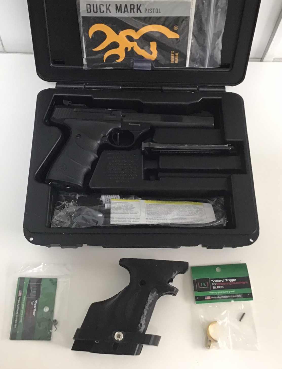 Hola a todos. Vendo Browning Buck Mark STD URX del 22. La pistola tiene dos años y se ha hecho un uso normal (Aprox. una vez por semana en la galería y subida a segunda). Tiene el kit de gatillo y muelle Gearbox (150€) (Peso reducido considerablemente). Entrego originales. Regalo cacha anatómica de fibra (40€). La pistola tiene un pequenísimo saltón, ya que esa parte es aluminio pintado, encima de la ventana de expulsión como se puede apreciar en la foto señalizada. Por lo demás, al arma está impecable. Se encuentra en León.