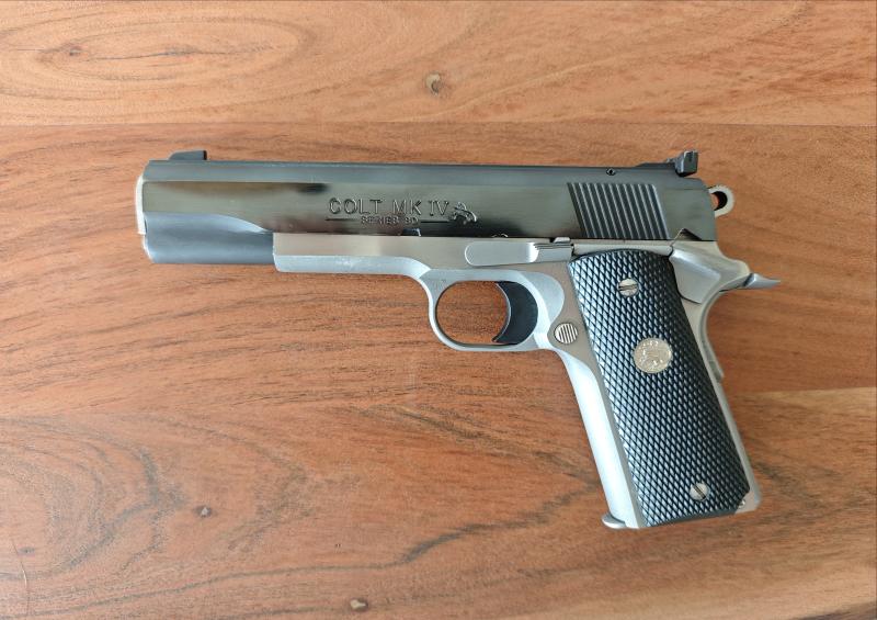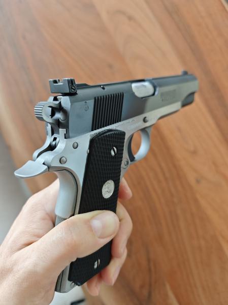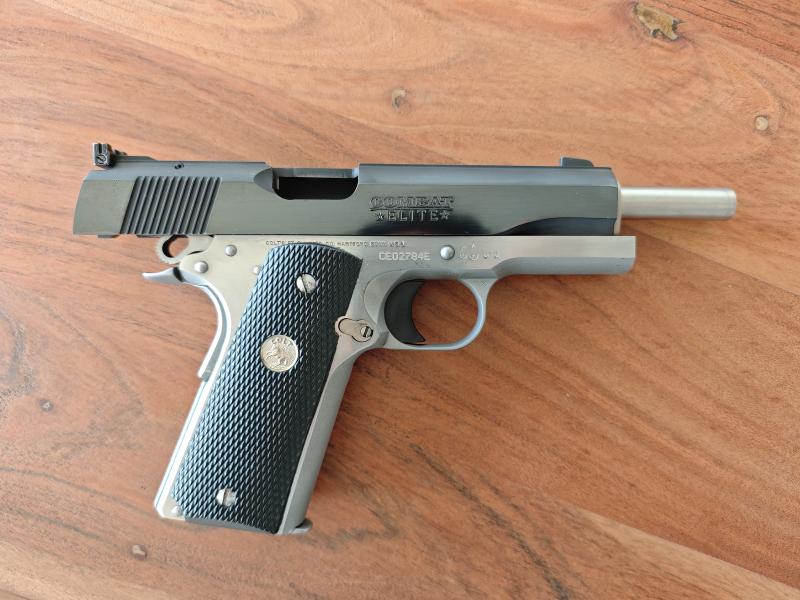 Vendo pistola Colt 1911 Combat Elite en calibre 38 Super Auto, con cañón de 5 pulgadas, alza regulable en altura y deriva, en estado tanto funcional como estético muy bueno.