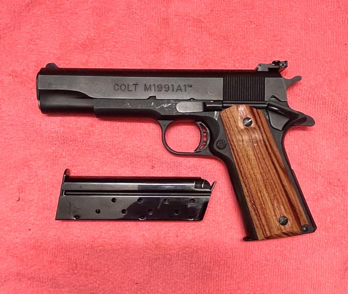 Pistola Colt 1991 A1 Serie 80 calibre 9mm. Cachas originales de goma, mas otras de madera. Dos cargadores y maletín. Precio 550 mas gastos de envió.