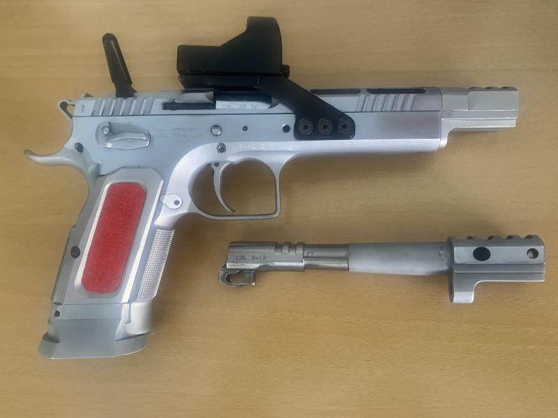 Tanfoglio Open caño del 38 y 9 el del 9 llevará 2000 tiros y el del 38 400 tiros escasos está impecable gatillo afinado, varios repuestos tiradores y retén corredera nuevos y algún muelle 4 cargadores y funda Todo 2000€ no vendo nada por separado