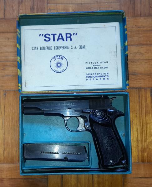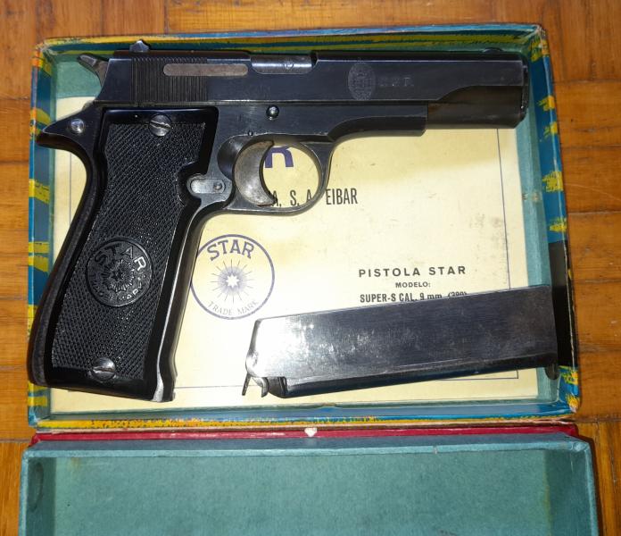 Pistola Star S, calibre 9 Corto, con dos cargadores, en perfecto estado mecánico y buen estado estético, lleva grabado el escudo de la Comisaría General de Policia.