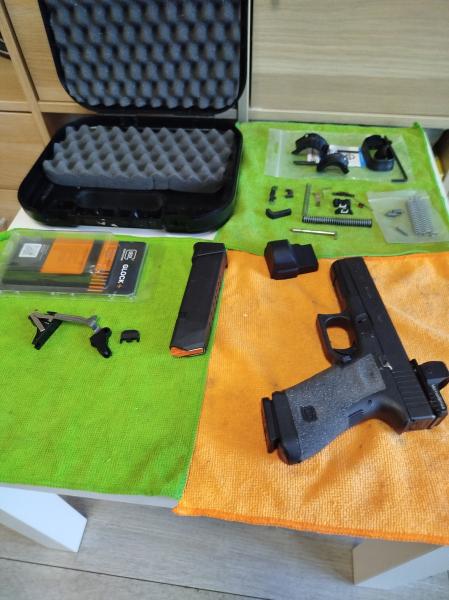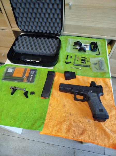 Año de fabricación: febrero 2021. Repuestos de prácticamente todas las piezas. Trabajo del agarre con carburo de silicio para un agarre magnífico. Glock Performance Trigger (GPT) pulido a espejo y eliminado el sobrerrecorrido para un reset mínimo. Montura en cola de Milano con Vector Óptics Red Dot. 2 cargadores ( 1 de 17T y otro de 19T ).