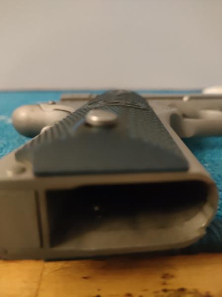 Cuando se le hizo el cambio de cachas,encontramos que uno de los bushings donde entra el tornillo solo admite vuelta y media, por lo que aunque agarra el grip,sobresale. Eso no se notaba con las cachas de pachmayr ,ya que la zona de la goma es más ancha y se quedaba el tornillo dentro al completo.