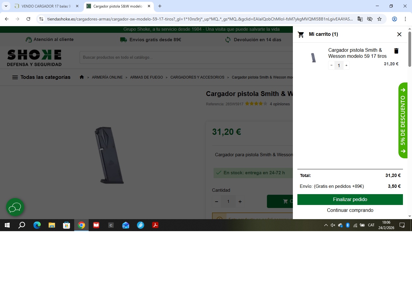 Vendo cargador S&W de 17 balas 9 mm Pb. para pistolas de la serie 5900 - 910 - 915 y 659. Está nuevo, ha disparado un par de series de 5 tiros y no se ha usado más.