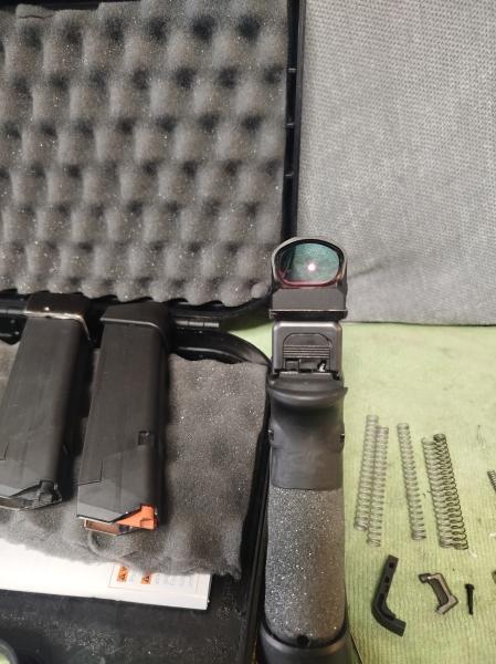 Tiene estás mejoras: punto rojo Vector Óptics de 3 Moas, 2 cargadores de 19 tiros, guia de retroceso de acero de Eemann Tech con muelles de 15 y 13 libras/fuerza. Muelles y desconector de competición, todas las piezas internas nuevas más las originales.+ De 350 Euros en mejoras.