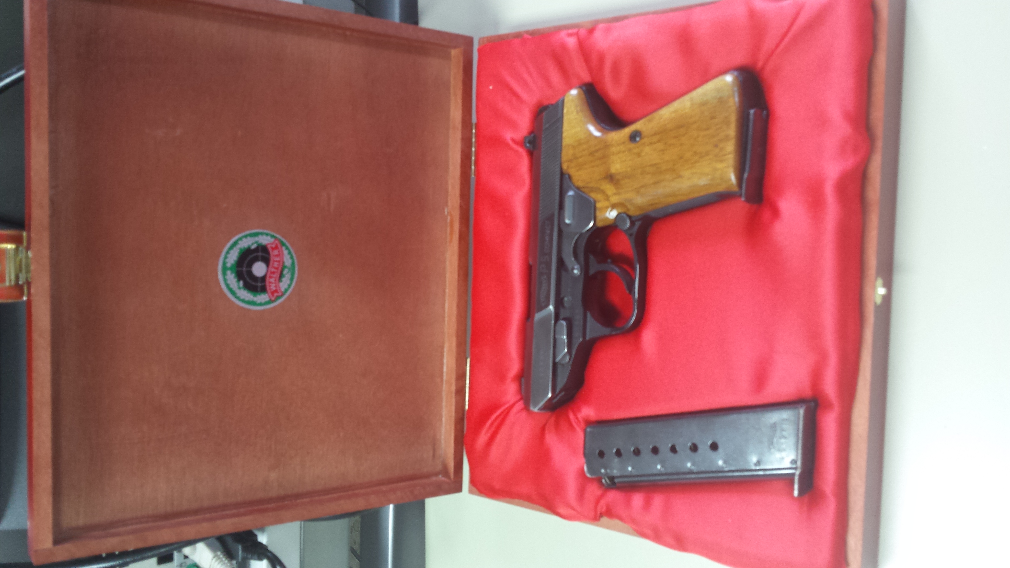 Con dos cargadores de 8 cartuchos del 9 mm Parabellum. Cachas en madera originales . Una pistola de las que ya no se fabrican. Ventana de expulsión en lado izquierdo de la corredera . Sistema de rodillos...una joya. Solo se fabricaron 6.500 unidades. Guiada en "A"