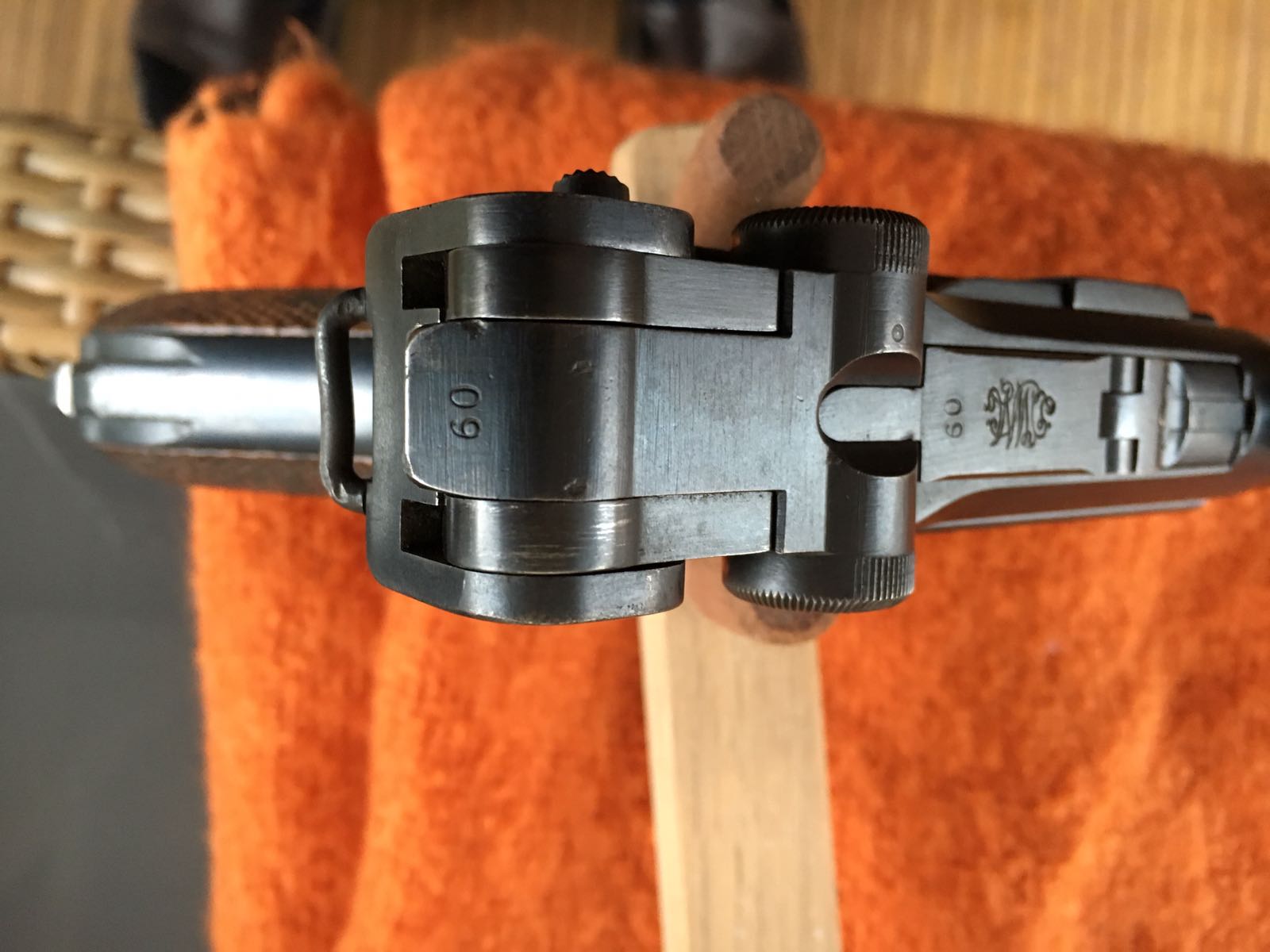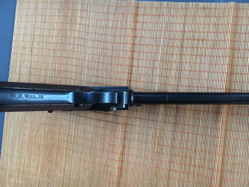 Es un arma recompuesta con piezas de varias armas. El cañón no está numerado y la corredera no se corresponde con la empuñadura, que esa sí es de una P08 de la Primera G.M. a tenor de los marcajes correspondientes a la Unidad.