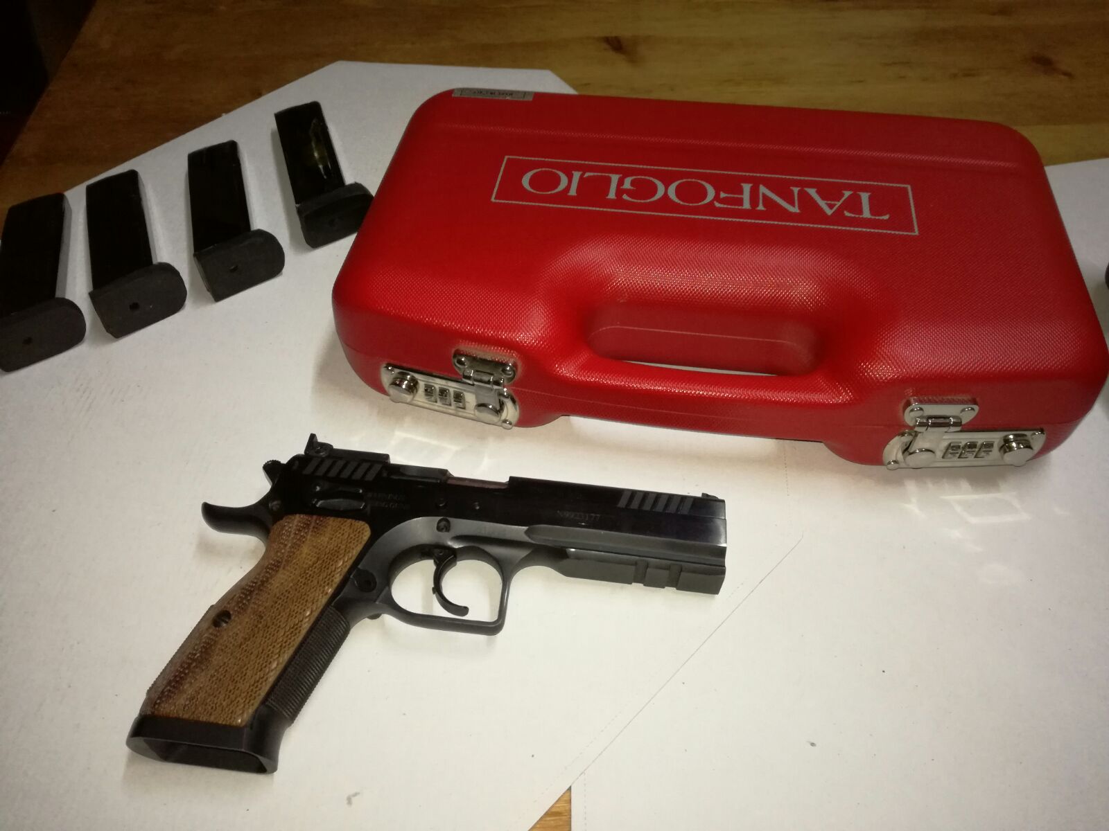 el arma fue comprada el 21/10/2013 en Shooting Bilbao y preparada para IPSC por Javier Les, está prácticamente nueva, por no decir nueva, ya que únicamente se empleó para hacer el curso de IPSC y dos tiradas sociales , se vende con cinturón , funda shadow 3D de extracción rápida, cachas metálicas small xtreme, cuatro cargadores, cuatro porta cargadores y maletín Tangfoglio con combinación, el valor de todo ello supera los 1300 €.