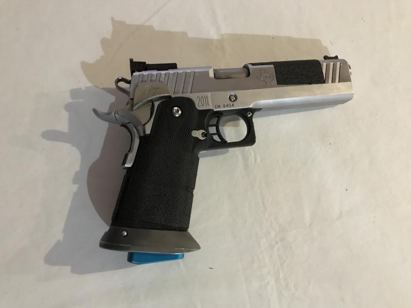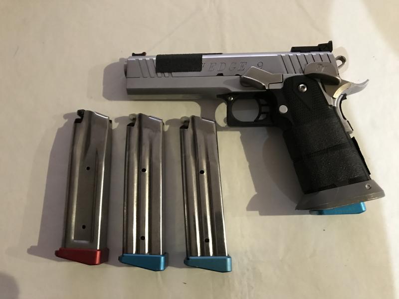 La pistola está perfecta, preparada para competir y a toda prueba. Funciona de maravilla y tiene cambiadas las piezas del seguro de aleta, va con el Tumbrest que sustituye al retén de corredera, barille de Inox para el muelle recuperardor, aguja XL, ..., 4 cargadores, 3 originales de STI ( 2 de los cuales no tienen ni 2 años) y uno SPS. Todos con muelles, elevadores y Tapetas de aluminio para poder contener hasta 20 cartuchos.
