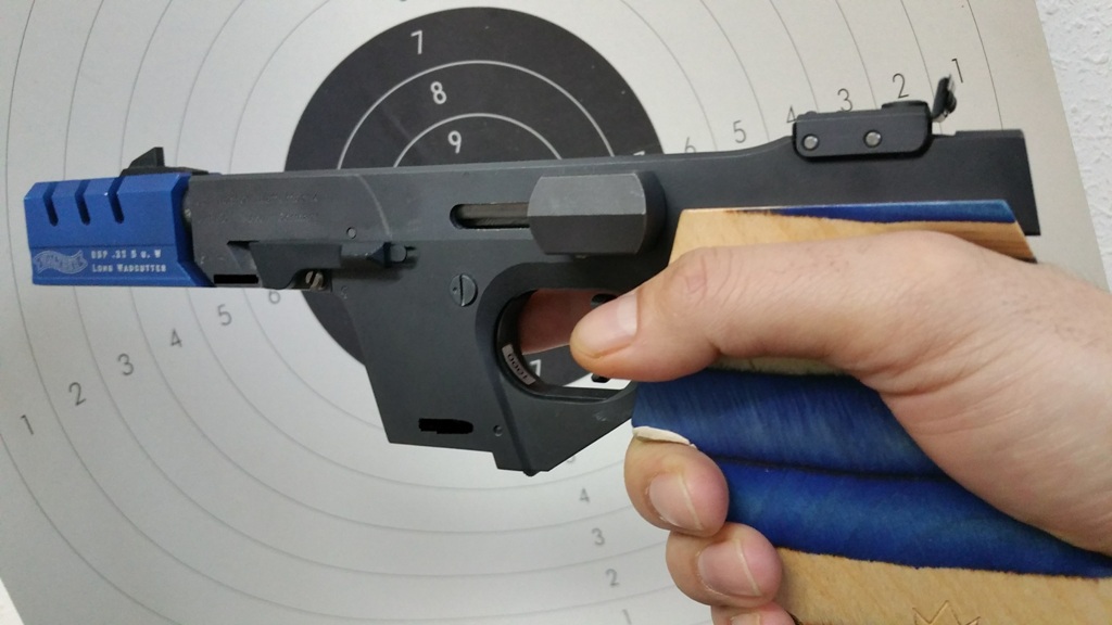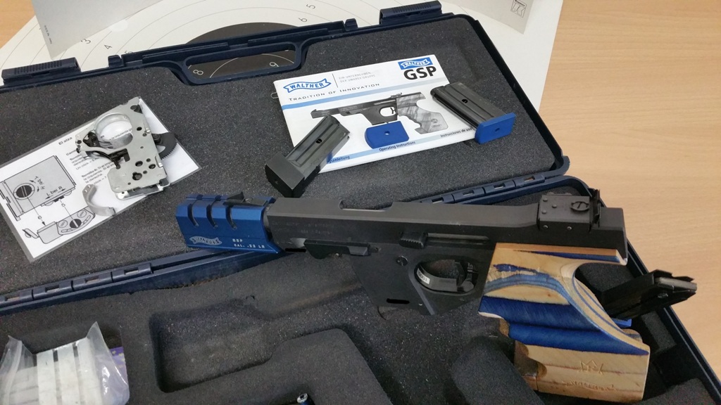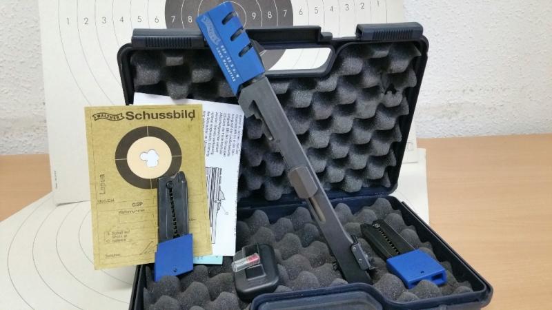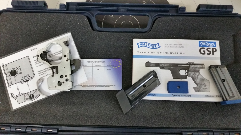 En estas fotos podéis ver la pistola del calibre 22. En uno de sus cargadores veréis un contrapeso en su base, el cual se puede quitar si queréis y poner nuevamente el original. Su manual de instrucciones... Y veréis también el disparador de entrenamiento de la antigua Walther GSP, el cual dispone de dos gatillos, normal y para dedos largos, podéis instalar en la pistola y efectuar cinco disparos en seco para entrenar la modalidad de velocidad, o para la parte de velocidad de las modalidades de Standard y Fuego Central, ya que dispone de un martillo de cinco dientes en lugar del normal que golpea al percutor, ideal para entrenar en casa o en la galería de tiro y así ahorrar munición.