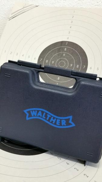 Caja original Walther con el carro del calibre 32, la prueba de tiro, sus cargadores, su ayuda para municionar el cargador, y el aliviapercutor.