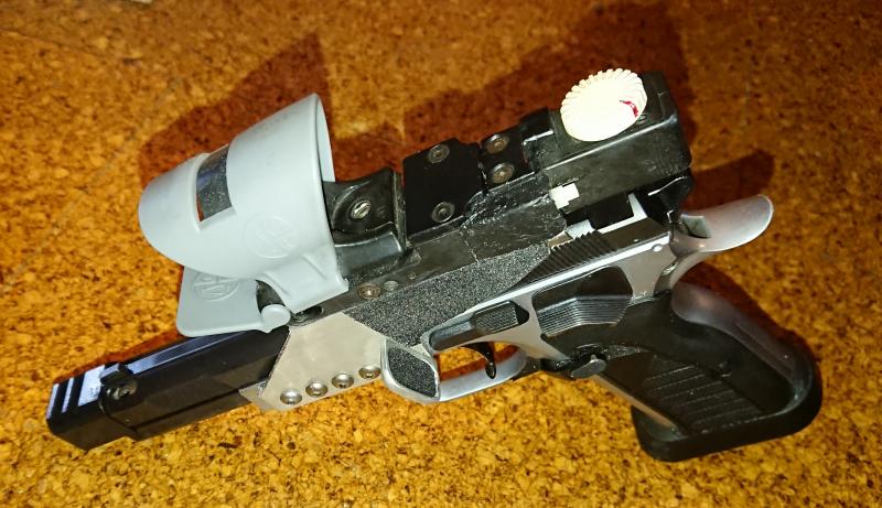 Muy poco uso aunque tenga años, con Visor Cmore con interruptor añadido para que no se gaste la pila (podria incluir side wing de aluminio para apoyos en mesa y pilas de repuesto), visera para el sol y pala para los gases, cachas de polímero para mano pequeña, apoyadedo, tirador de corredera, fannel de polímero, Seguro ancho custom, gatillo flat xtreme y Martillo delta xtreme, retenida de cargador extendida (pieza difícil de encontrar). Muelles Shooting bilbao y sear nuevos.