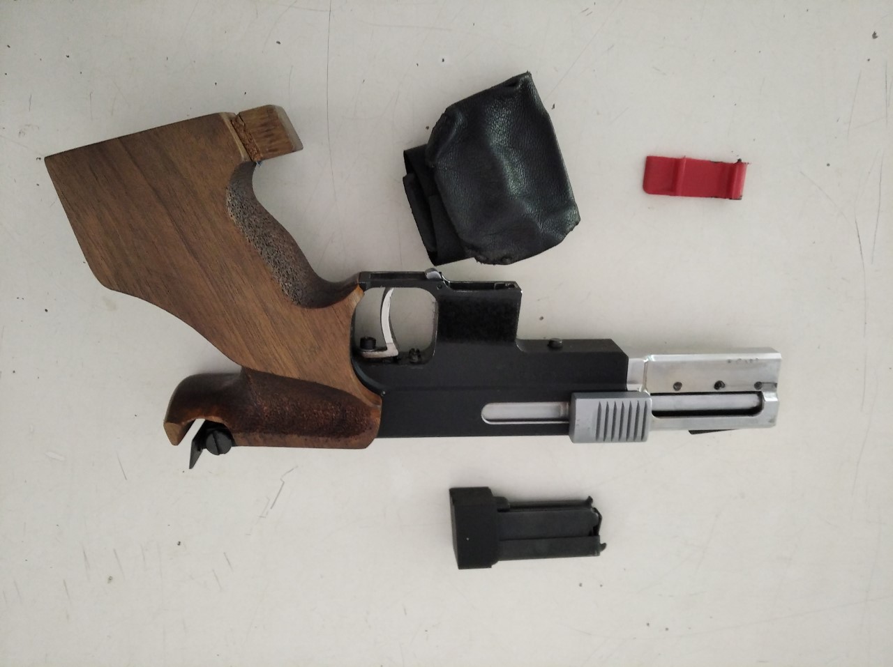 La entrego con tres cargadores y su maletín. También lleva caza-vainas. La retenida de la corredera falla ocasionalmente, en competición utilizo la pieza de plástico roja que aparece junto a la pistola.