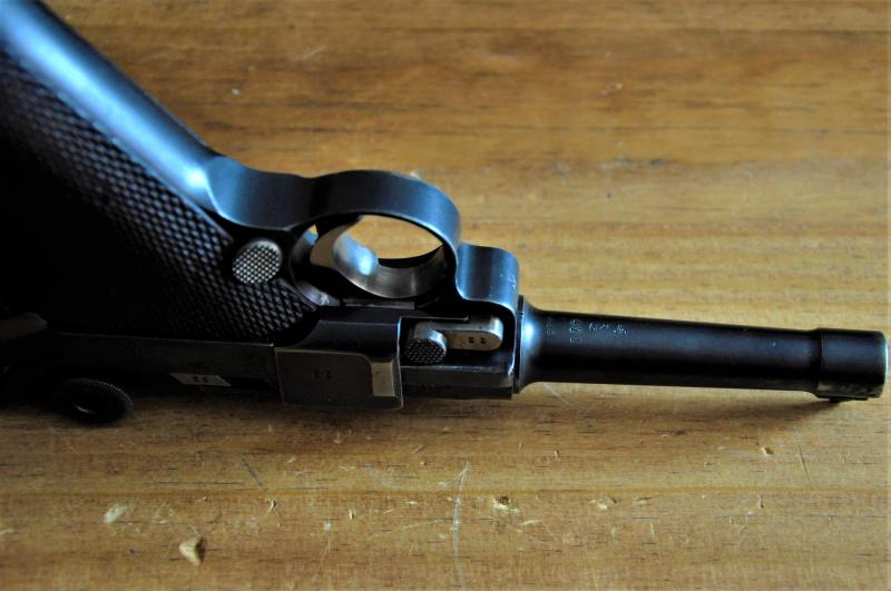 A falta de ver más fotos como puedan ser el armazón y corredera vistos desde dentro, el acabado rust blue parece original si nos atenemos, especialmente, a los halos que presentan los números del cañón, si bien está repunzonada. Las piezas menores serían en amarillo paja, aunque este acabado dorado se nota gastado en general. Los cargadores corresponderían a Mauser, pero de época inmediatamente anterior al ser niquelados -1936 previsiblemente, por el que mantiene marcaje original y no está remarcado de los dos (Los correctos para esta época serían de talón de aluminio también, pero el tubo pavonado azul). Dicho esto, es una bonita pieza y te deseo mucha suerte en la compra. Casualidades de la vida, tengo una Luger con el mismo número y, quizá, mismo sufijo también, pero de otro año !!. Si fuera g, sería el mismo!! (No lo aprecio bien).