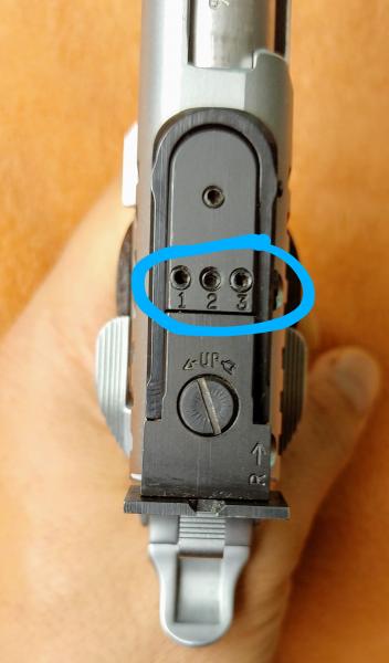 Fotos del Alza Aristocrat. Tienes tres posiciones, 1 Diana de Precisión a 25 m., 2 Transporte (el alza baja hacia la corredera para transportarla sin que pueda sufrir algún golpe fortuito, algunos dicen también que es una posición para disparar a 50 metros. Yo no lo he probado, jejeje.), posición 3 para disparar a dianas de velocidad. Se puede cambiar fácilmente de una posición a otra, girando el tornillo lateral con un tercio de vuelta. Luego, cada posición es regulable en altura independientemente con sus tornillos allen en la parte superior del alza, o puedes modificar todas las posiciones en altura con el tornillo grande "UP".
