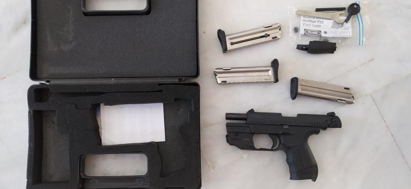 Vendo Walther P22, impecable, con tres cargadores y puntero láser original de la marca. Completa con maletín, llave de seguridad cachas y puntos para intercambiar. 200 euros.