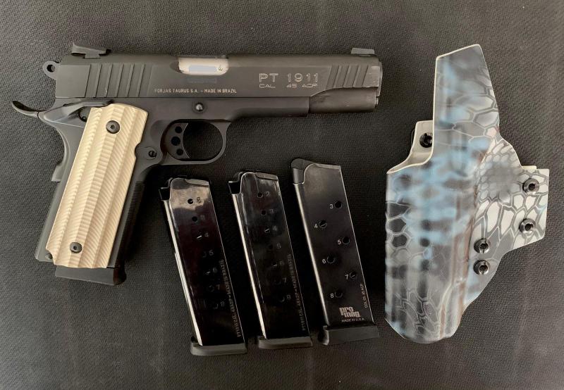 Vendo Taurus 1911 del 45ACP, como nueva, muy poco uso, guiada en F, en su caja original con sus llaves y manuales, de regalo 4 cargadores, funda Trex Arms de porte oculto y 1 aliviamuelles, 350€+ 30€ de portes si son necesarios , el arma esta en Canals (Valencia) tlf. 687993089 (VENDIDA)