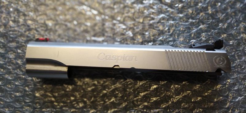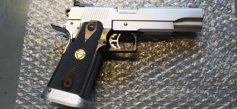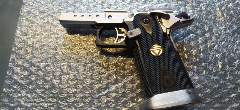 El armazón y piezas interiores son SVI INFINITY, la corredera CASPIAN y monta un cañón pesado con rampa de la casa SCHUEMANN ULTIMATCH.