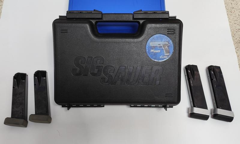 Pistola Sig Sauer P226 X-Six 9 mm Para. y carro original Sig Sauer del 22 LR, con su maletin, 4 cargadores del 9 Para. Los 2 originales de 19, y 2 de 17, y 4 cargadores del 22LR, el que trae de serie, otro igual y 2 de 10.