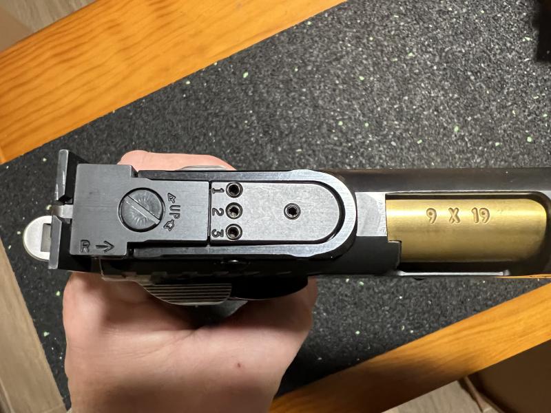 La pistola se encuentra en perfecto estado de funcionamiento y estético. Con su manual de instrucciones y caja y cachas originales. El disparador metálico y el alza Aristocrat. Es una de las mejores armas de 9mm para precisión. Una verdadera máquina de hacer puntos.