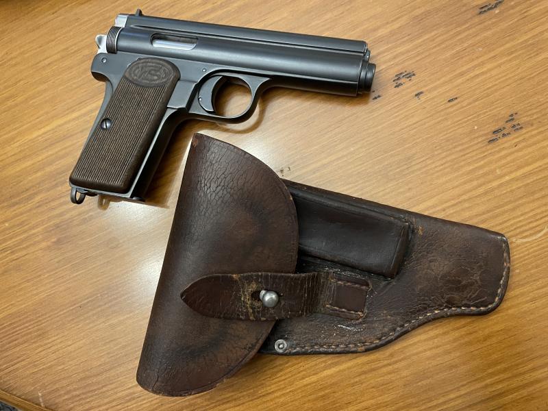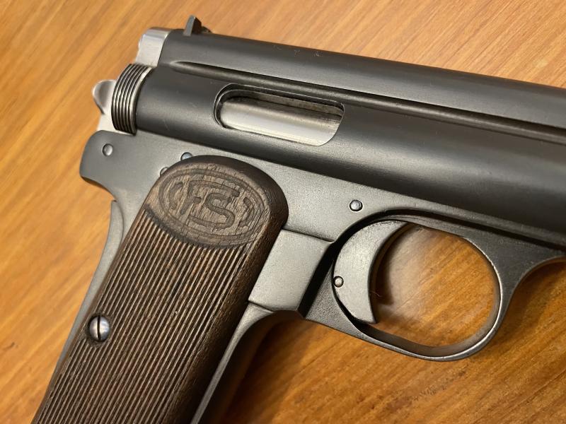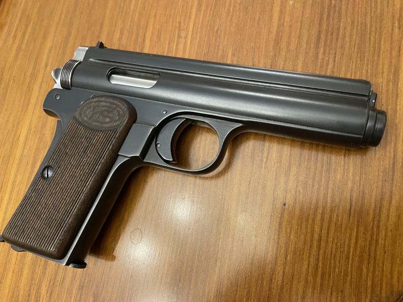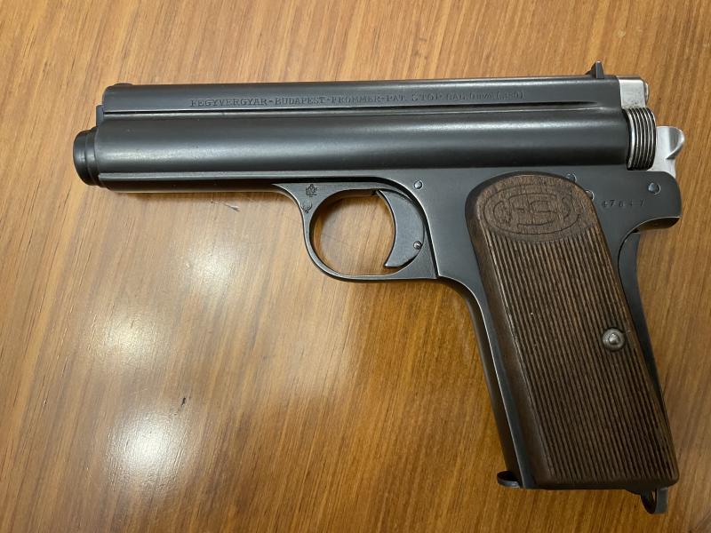 Se trata de una pistola Frommer M1912 conocida también por la denominación Frommer Stop. Para no hacer el anuncio demasiado tedioso, os facilito un enlace de este mismo portal donde se habla de la historia de esta curiosa arma, cuyo rasgo técnico más peculiar es el empleo de un sistema de retroceso largo más propio de armas largas (Browning Auto5, Remington Model8) que cortas, siendo las pistolas diseñadas por Rudolph Frommer verdaderas excepciones a la norma. Aquí tenéis el enlace: https://www.armas.es/armas-y-accesorios ... on-hungara