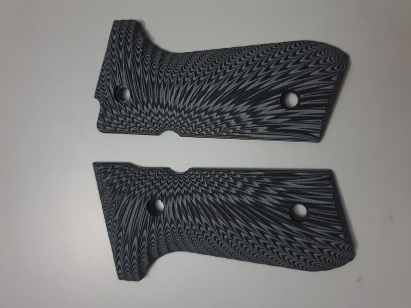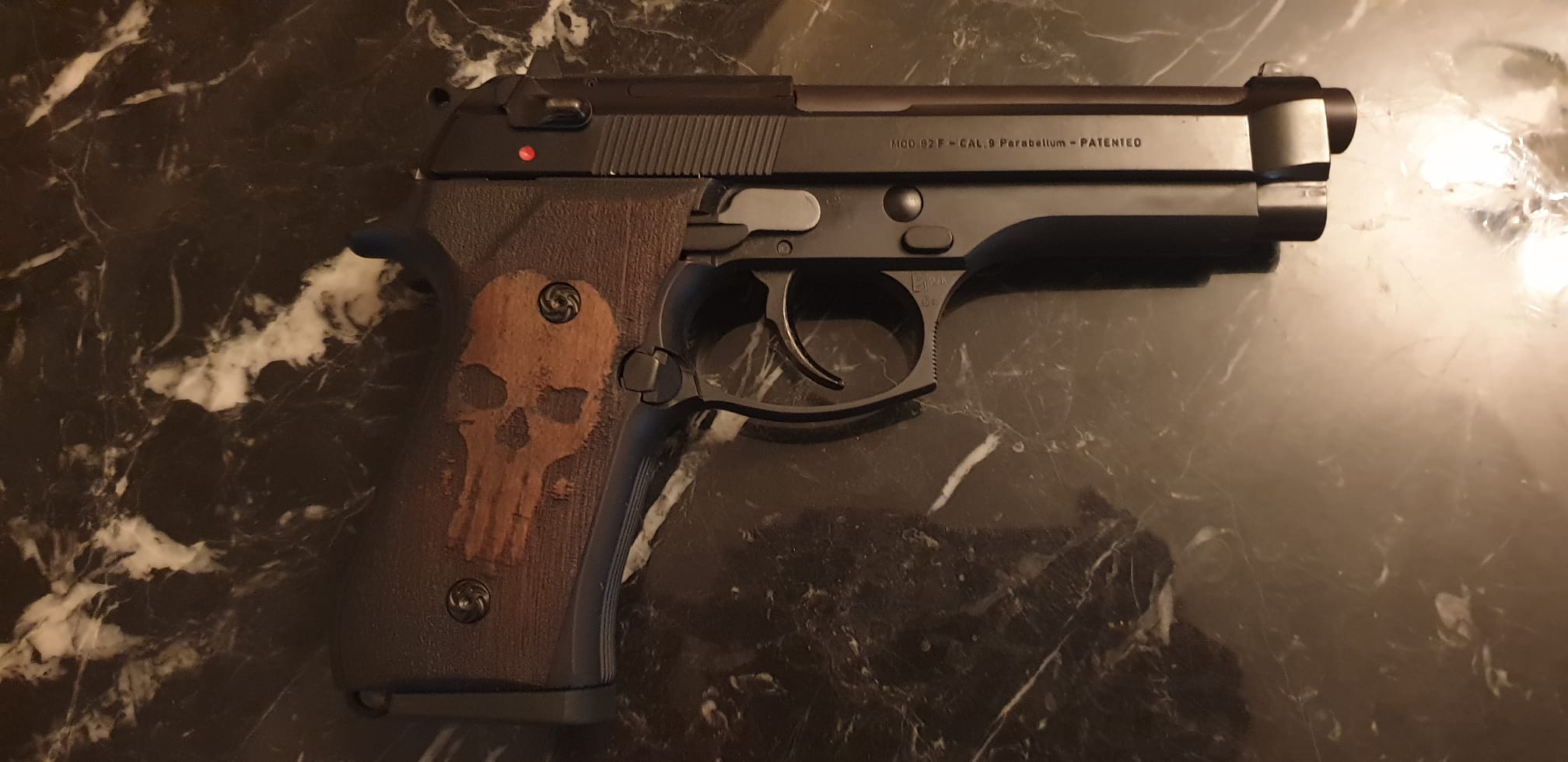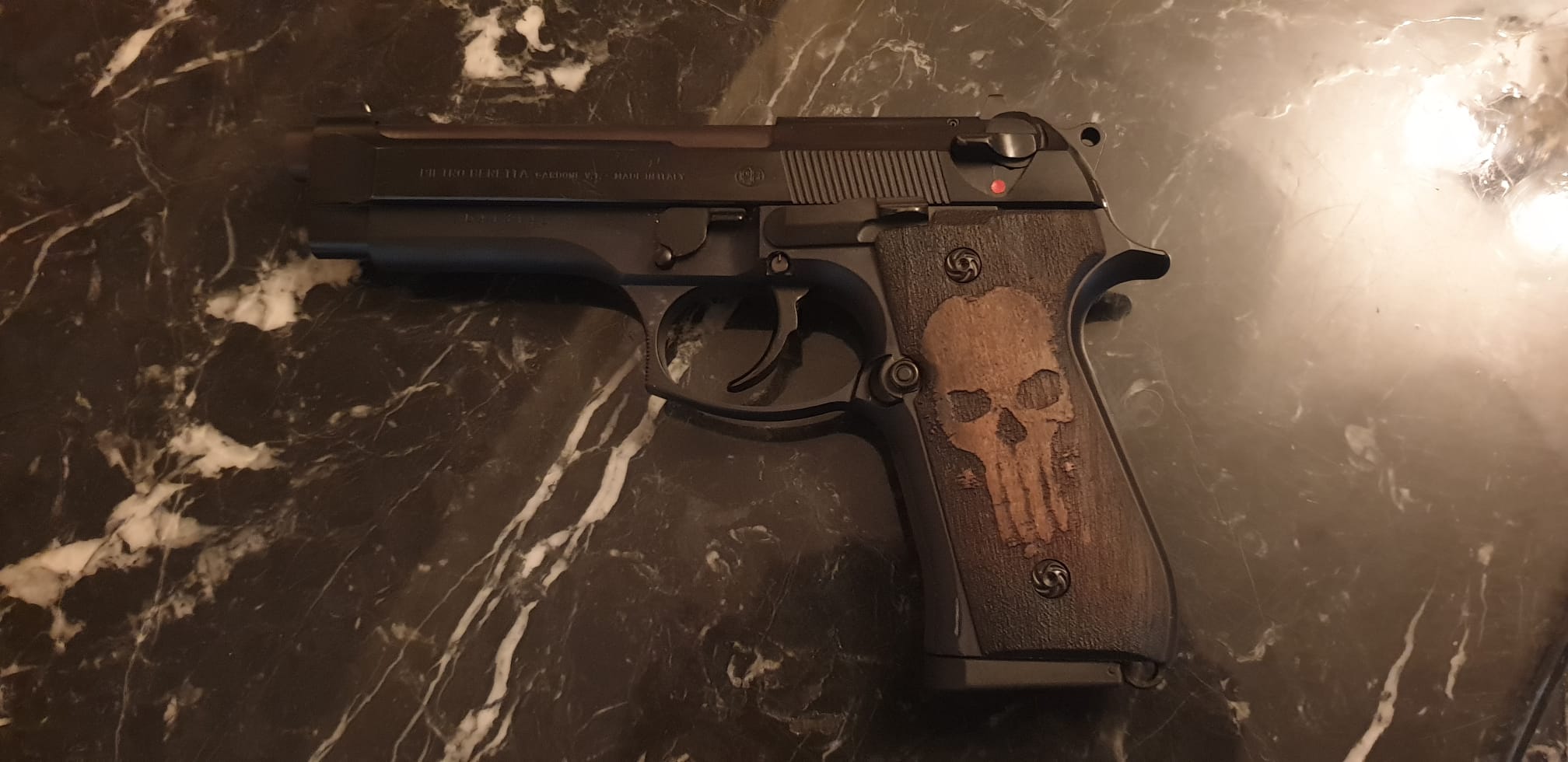 Vendo Beretta 92 F pavonada en negro con maletín original reforzado (Le he puesto bisagra y cierres de acero), tres cargadores (Uno de ellos con taconera) y tres juegos de cachas (La original, otra rayada tipo cebra en blanco y gris y la de la calavera del "Castigador" tallada en madera).