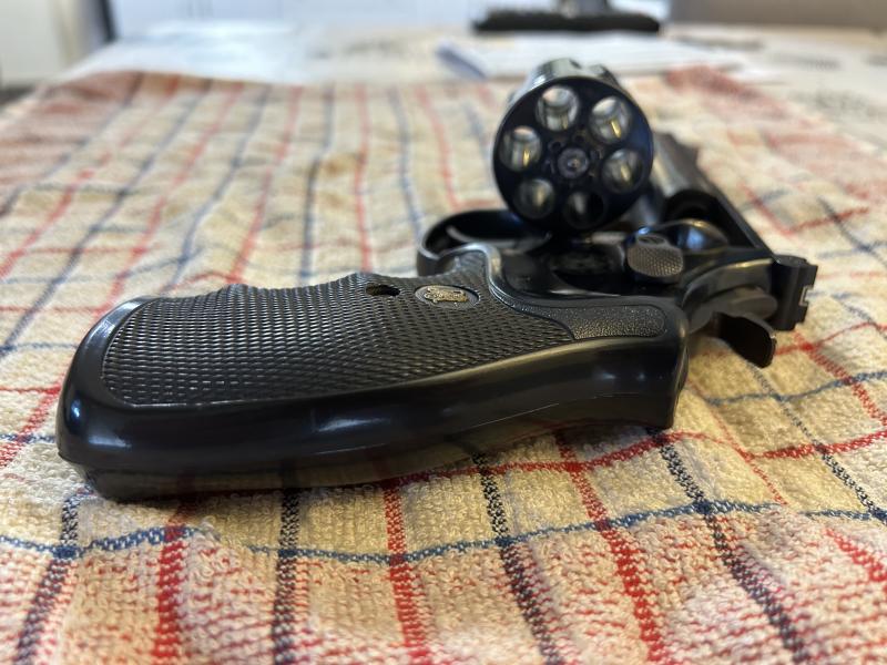 Hola, se vende S&W del 357 Magnum, aunque siempre ha tirado con .38, guiada en F y de cuatro pulgadas.