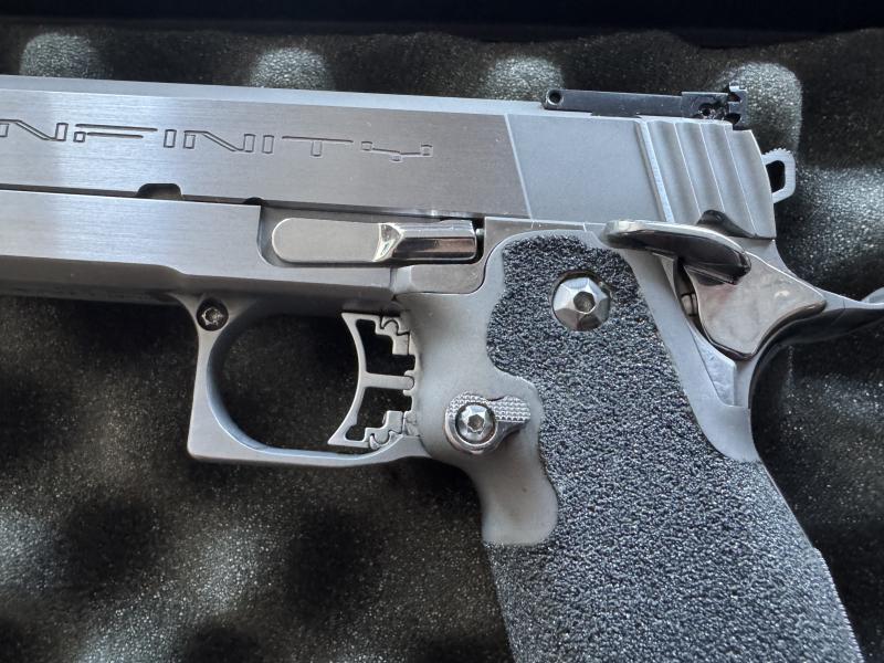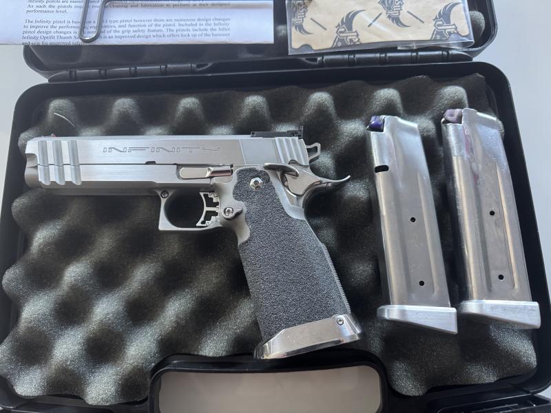 Vendida.... Infinity perfecta sin golpes ni arañazos visibles, con dos cargadores y lija nueva, 9 mm, nunca ha hecho IPSC, se puede ver por las marcas que se hacen en IPSC.