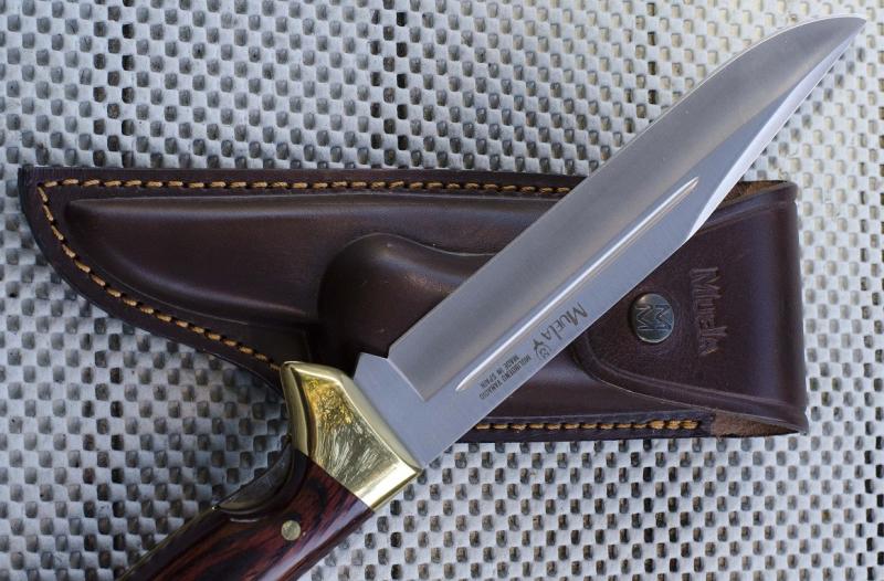 Con hoja de 18 cm de cromo-molibdeno-vanadio de gran dureza templado a 1.100ºC y empuñadura de madera y latón de 13,5 cm.