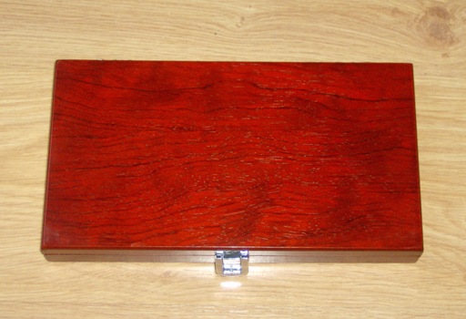Caja de madera color Caoba acolchada, con separadores para sujetar y exponer los cuchillos y cierre metálico.