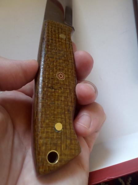 En acero carbono O1,lomo redondeado,cachas en micarta de saco.