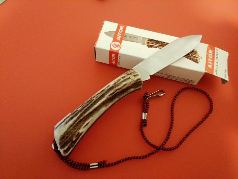 NAVAJA Aitor-Ermua, modelo DIANA, con empuñadura de cuerno de ciervo africano , sambar. dispone de seguro, cordón fiador , caja correspondiente a modelo y época . Esta es una navaja de gran calidad, de tamaño mediano-grande, compacta, contundente, muy bien construida, con un buen agarre, como consecuencia de sus cachas. Elegante de las pocas que he visto, muy vistosa y llamativa por sus contrastes de color en la cuerna, LA VENDO O CAMBIO por tenerla repetida y llevar años en vitrina.