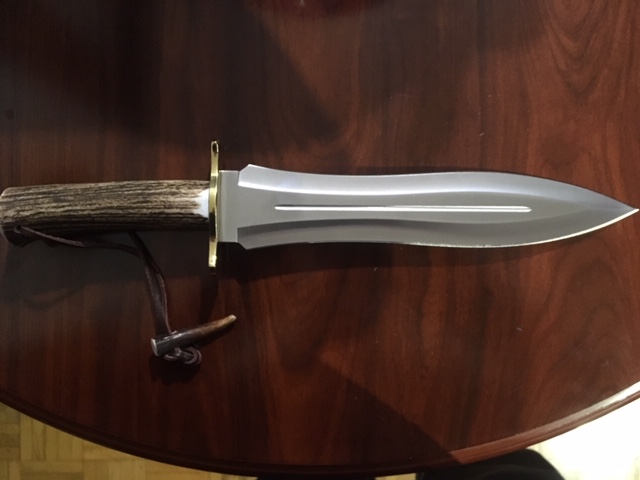 Cuchillo de Remate MUELA PODENQERO: Acero X50rMoV10 molibdeno vanadio. Dureza del acero 57,58 HRC. Forma de la hoja: Punta de lanza doble filo, Daga. Puño: Asta de ciervo. Funda de cuero marrón con el logo de Muela. Estructura del cuchillo; enterizo. Longitud de la Hoja 26cm. Mango 12cm. Longitud total 39.5cm. Peso: 630gm. Fabricado en España.